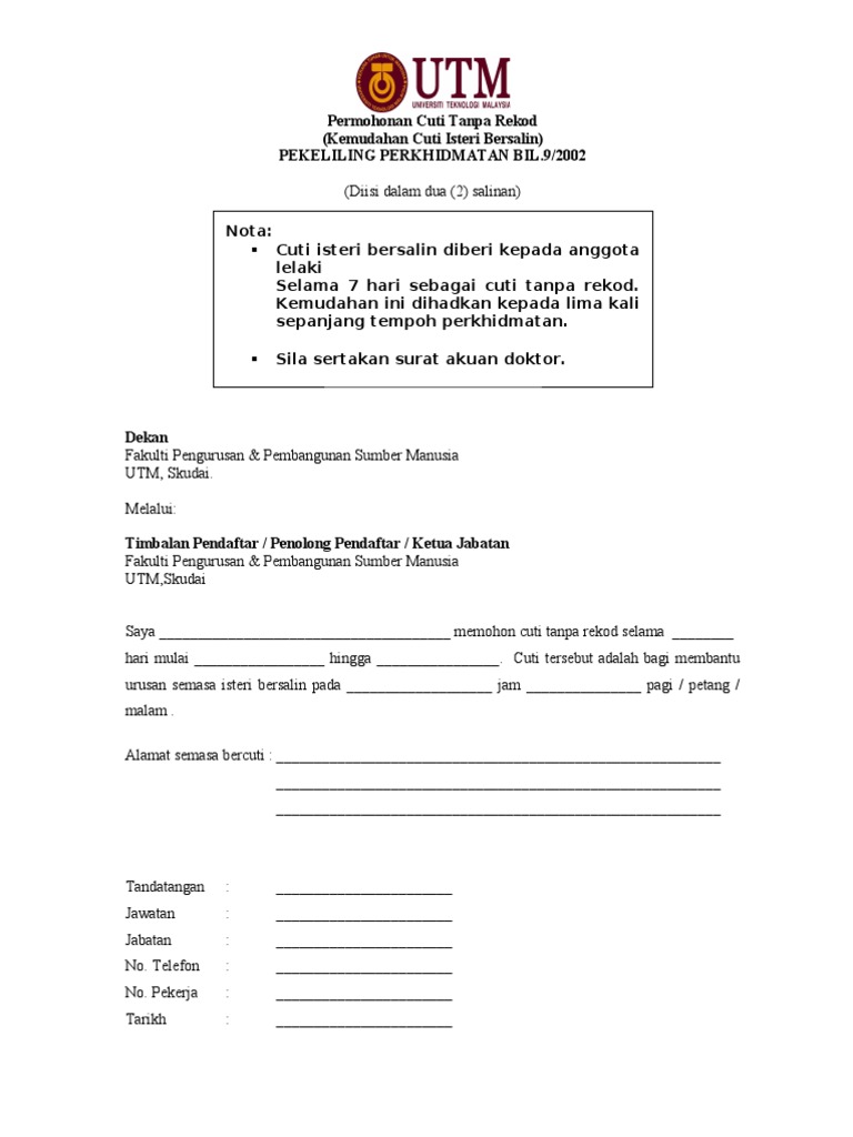 Shamsuddin bardan berkata peningkatan tempoh cuti bersalin itu juga dilihat bakal meningkatkan kos awani pagi membawakan kemaskini terkini mengenai berita dalam dan luar negara yang dilaporkan di www.astroawani.com bersama geegee. Dan lagi penyata atau borang berkaitan cuti selain cuti rehat/cuti rehat khas juga akan terhasil (output) seperti penyata cuti sakit, cuti bersalin, cuti belajar, cuti haji/umrah dll Download lagu contoh surat mohon cuti bersalin awal 28 images borang mp3 dapat kamu download secara gratis di metrolagu. Microsoft word borang permohonan cuti bersalin awal terkini.doc author: Human capital management telekom malaysia berhad borang permohonan cuti bersalin. Antara yang dibincangkan dalam akta tersebut ialah Cuti bersalin tanpa gaji bagi memenuhi tempoh cuti bersalin. How to stamp the tenancy agreement property malaysia. Leave a reply cancel reply. _____ borang kemudahan cuti bersalin pegawai perkhidmatan awam arahan: Untuk melihat detail lagu contoh surat mohon cuti bersalin awal 28 images borang klik salah satu judul yang cocok, kemudian untuk link download contoh. 11 7 2013 1:37:15 pm. Perhatian buat pekerja swasta yang ingin membuat permohonan cuti bersalin swasta 90 hari tahun 2021.