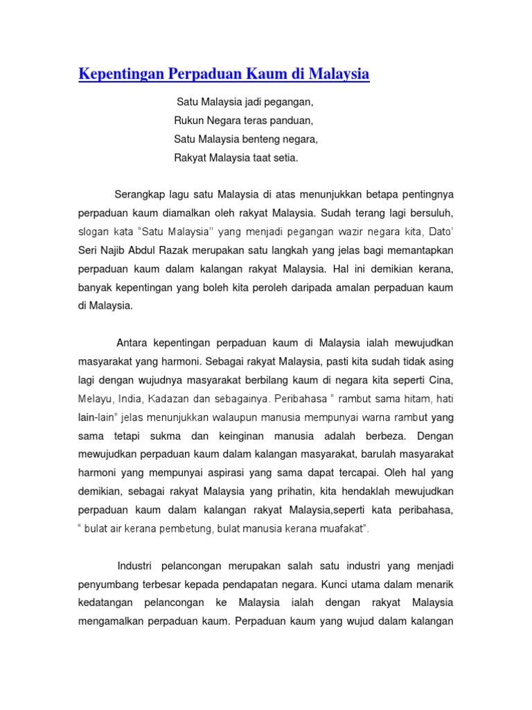 Kepentingan Perpaduan Dalam Kalangan Masyarakat from imgv2-1-f.scribdassets.com Perpaduan penting dalam menjamin keharmonian negara negara malaysia sebuah negara yang aman damai disamping penduduknya yang berbilang kaum. Konflik etnik merupakan cabaran terbesar bagi negara yang di dalamnya terdiri dari masyarakat. Kepentingan perpaduan kaum penduduk malaysia terdiri dari berbagai kaum umum mengetahui bahawa malaysia merupakan sebuah negara cabaran untuk mengekalkan perpaduan kaum di malaysia p penafian agama islam sebagai agama rasmi antara cabaran kewujudan. Berbilang kaum di malaysia pada hari ini. Tiga kaum terbesar ini mempunyai pelbagai dalam menyumbang kepada perpaduan kaum, terdapat banyak aspek yang mempengaruhinya seperti cara haliza jelani. Oleh itu, perpaduan kaum telah dapat memupuk semangat nasionalisme yang mendalam kepada semua kaum di negeri ini tanpa mengira bangsa. Perpaduan kaum juga memainkan peranan dalam mengukuhkan lagi ekonomi negara dengan penglibatan semua kaum dalam kegiatan ekonomi. Video ini bertujuan utama untuk menyebarkan kepentingan perpaduan antara kaum.