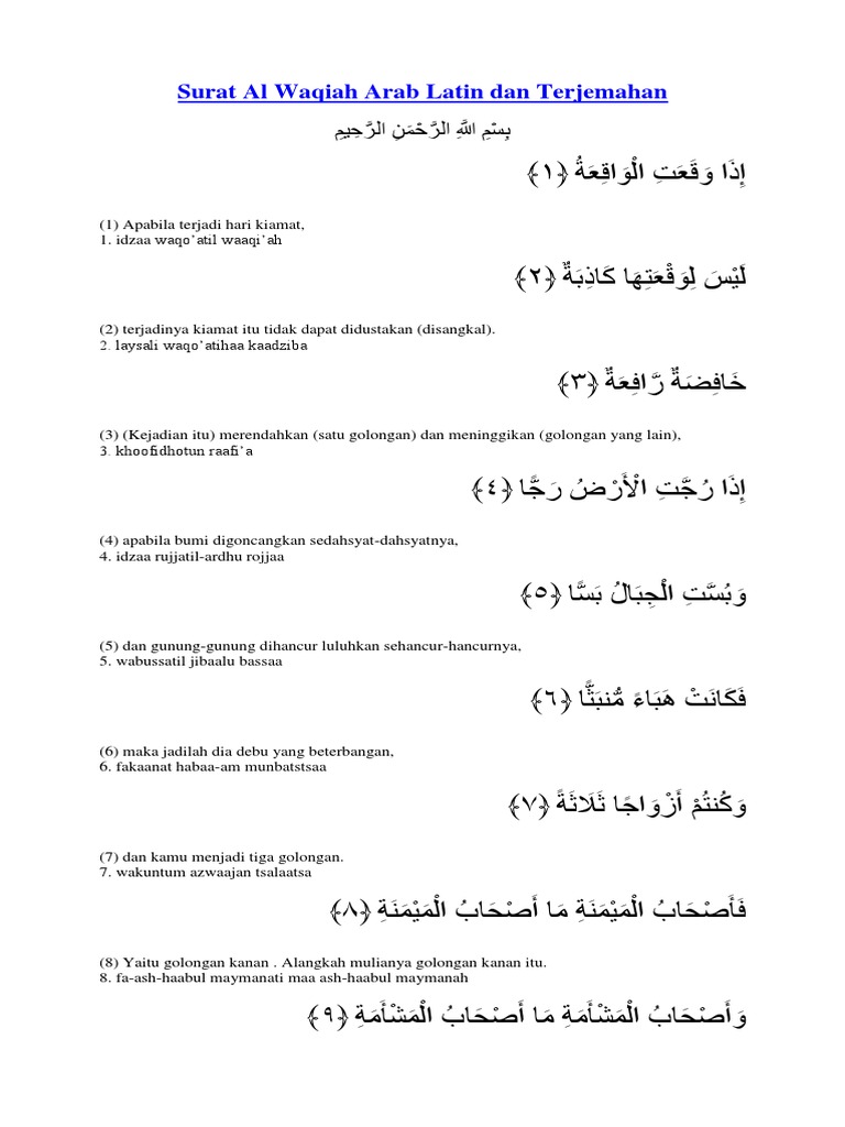 Please tell us if you found a mistake while you read this surah, thank you. Surat ini terdiri atas 96 ayat dan termasuk golongan surat makkiyah. The people will be divided three camps: Read quran surah waqiah text full arabic also in english translation. Baca dan belajar surah waqiah dengan terjemahan dan transliterasi untuk mendapatkan keberkatan daripada allah.
