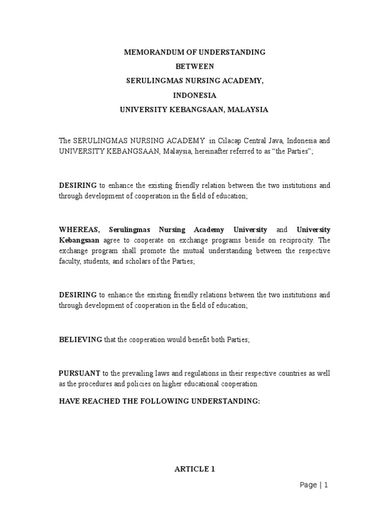 Ceda has signed several memorandums of agreement with various organisations within botswana and the region. Between serulingmas nursing academy, indonesia university kebangsaan, malaysia. It was a historical day as segi university entered into a memorandum of understanding (mou) with national defense university of malaysia (upnm) to develop. A memorandum of understanding (mou) is a type of agreement between two (bilateral) or more (multilateral) parties. On august 7th, api had signed a memorandum of understanding with linton university college, malaysia.